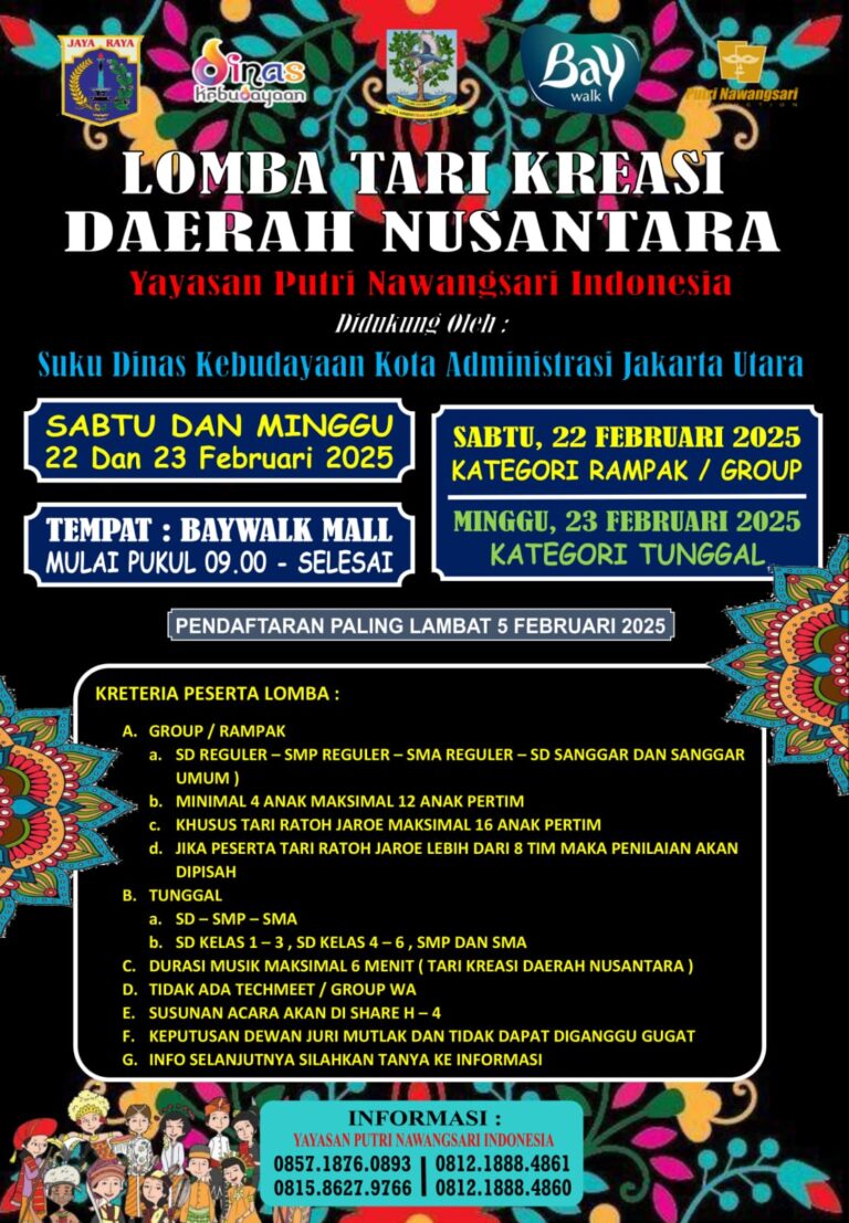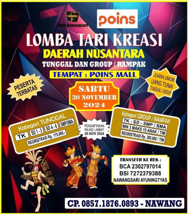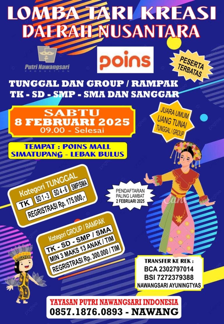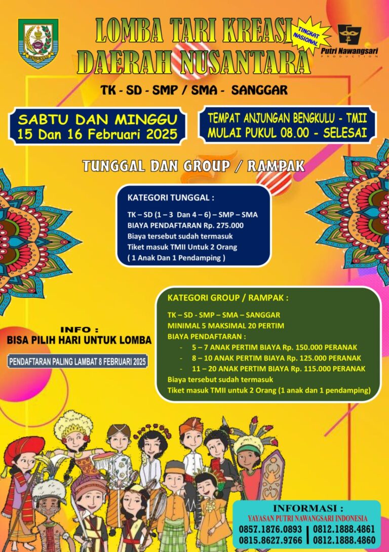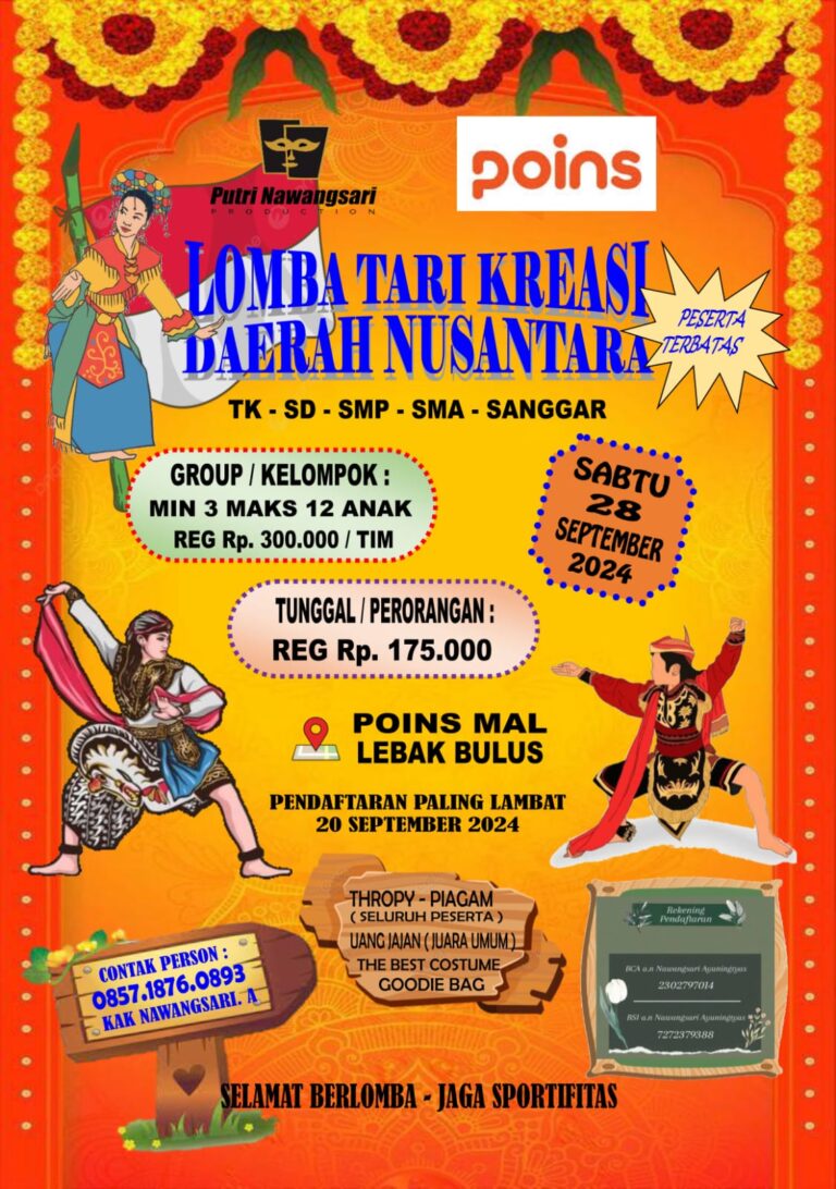 EventLOMBA TARI KREASI DAERAH NUSANTARA TK-SD-SMP – SMA – SANGGAR 20 September 2024pnawang25April 17, 2025